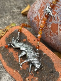 This beautiful and unusual necklace features a intricately carved silver oxidised fox pendant on a string of 4mm carnelian beads.