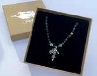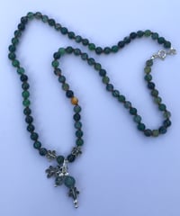 Each of the beads have been chosen to represent the colours from the original print. The beads are semi precious stones, featuring a combination of Mookite, Moss Agate and Sodalite.