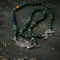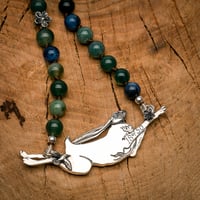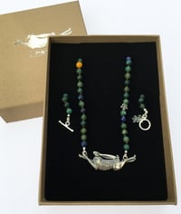 The hare sits on a beaded chain, each of the beads have been chosen to represent the colours from the original print. The beads are semi precious stones, featuring a combination of Mookite, Moss Agate and Sodalite. There is also one solid silver, geranium bead nestled in amongst the stone.