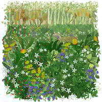 This rich image features a spring woodland in full bloom. A plethora of woodland floor species of flowers blooms brightly in this opulent scene. Dandelions, primroses, anemones and violets all vie for light in the shade of a woodland canopy, whilst shy muntjac deer creep past behind and a hen pheasant struts through the ferns.
